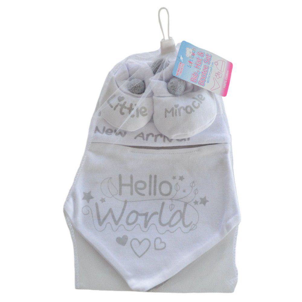 Includes bib, hat, and booties