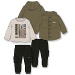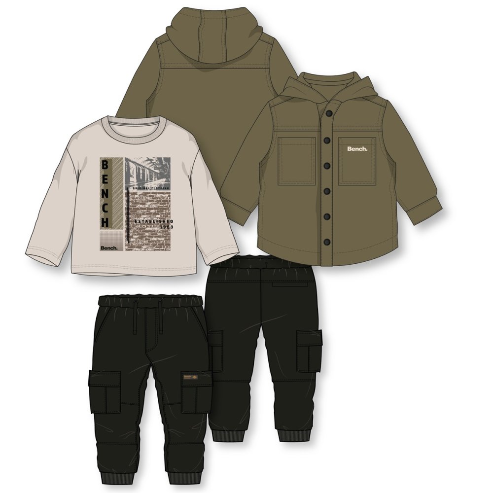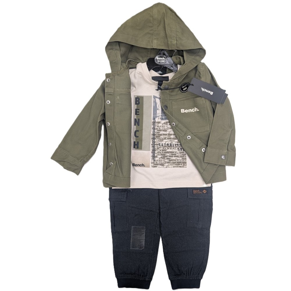 Keep him looking cool and comfortable with this fashionable Bench 3-piece outfit. Featuring a hooded twill shacket for lightweight warmth, a soft long-sleeve top, and denim cargo trousers for a trendy finish, this set is perfect for everyday wear, playdates, or family outings.